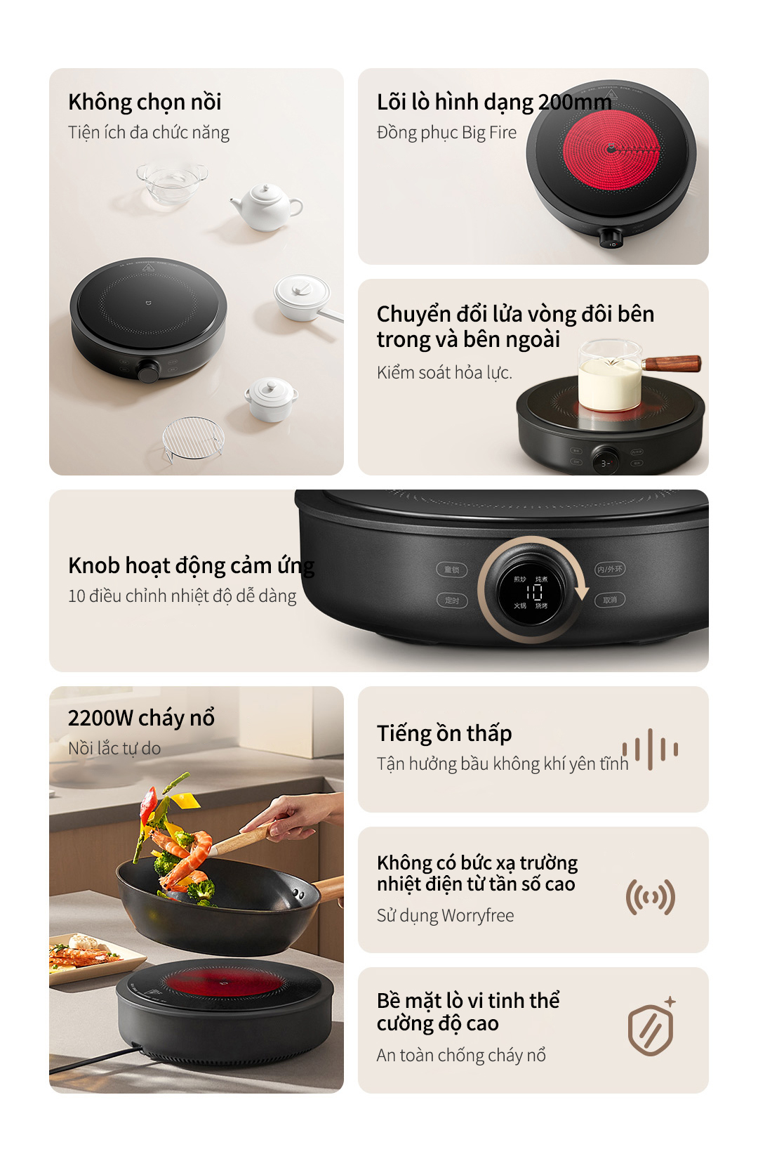 2. Công suất mạnh - kiểm soát nhiệt chính xác: 2200w siêu mạnh + chế độ lửa kép chuyển đổi linh hoạt + 10 mức điều chỉnh nhiệt